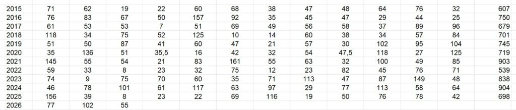 Sur ces dix dernières années l’année 2021 et l’année 2024 furent les plus arrosées avec chacune un total de 904 mm. Le graphique de gauche compare cette année 2025 ( en vert ) et l’année 2026 ( en bleu ) avec la plus pluvieuse 2024 ( en orange )